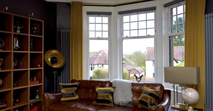 White upvc sliding sash windows in a Victorian property with white wainscot paneling