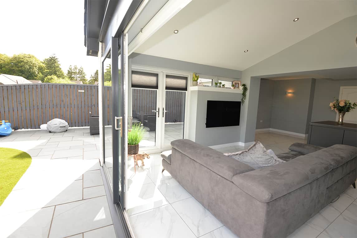 Having seen the 3D visual options from CR Smith they opted for an open plan gable tiled sunroom extension. In addition to a set of French doors, they have a large set of sliding patio doors on the gable end which really open up the living space into the garden.